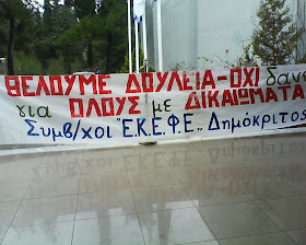 Μόλις πριν από 2 ημέρες, η Διοίκηση του "Δημόκριτου", βλέποντας ότι με το ξήλωμα των 70 συμβασιούχων αντιμετωπίζει σοβαρά προβλήματα η λειτουργία του Ερευνητικού Κέντρου, επανέφερε περί τους 10 συμβασιούχους! Το πρόβλημα όμως συνεχίζεται και εντείνεται για τους υπόλοιπους 60 που παραμένουν στην ανεργία, οι οποίοι είναι έτοιμοι να καταθέσουν από εβδομάδα, ασφαλιστικά μέτρα σε βάρος της Διοίκησης για την εκδίωξη την οποία έχουν υποστεί. Τετάρτη 9 Μαρτίου 2011