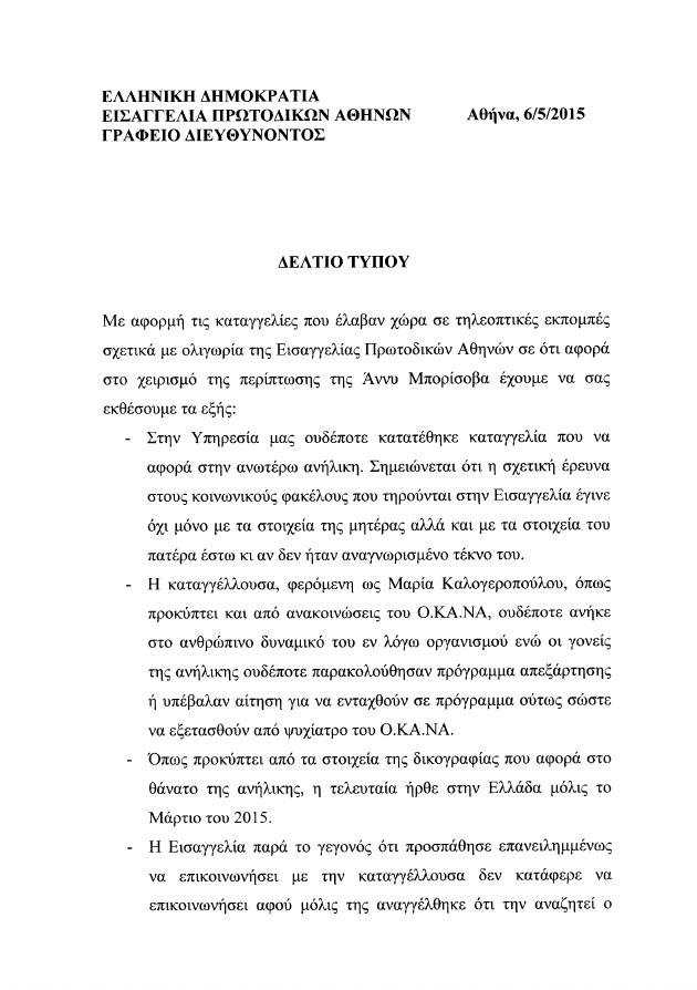 Ολόκληρη η ανακοίνωση της Εισαγγελίας έχει ως εξής: