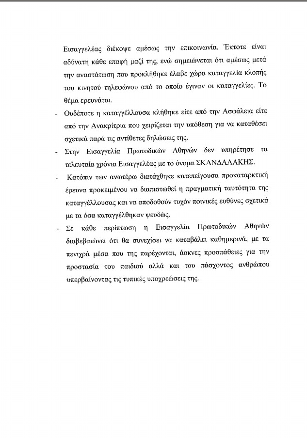 Στην ανακοίνωση της Εισαγγελίας σημειώνεται επίσης ότι παρότι προσπάθησαν να συνομιλήσουν μαζί της τηλεφωνικά, μόλις ενημερώθηκε ότι την αναζητά ο εισαγγελέας δεν απαντούσε στα τηλέφωνα, ενώ λίγο αργότερα δήλωσε και κλοπή κινητού (σ.σ.: προφανώς για να υποστηρίξει ότι το κινητό της είχε κλαπεί και ότι ο δράστης τηλεφωνούσε ως Μαρία Καλογεροπούλου).